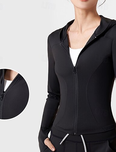 Mulheres Casaco com capuz Jaqueta de treino Leve com buracos para os polegares Manga Longa Esportes Côr Sólida Blusas Para Academia Esportivo Corrida Ajuste justo Roupas Esportivas