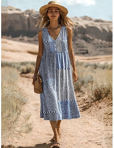 Mulheres Vestido midi Vestidos Para o Verão Vestido da bainha Vestido de verão Férias Casual Boho Diário Feriado Vestido de verão Normal Geométrica Sem Manga Decote V Azul Marron Verão