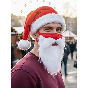 Conjunto de gorro e máscara de Papai Noel masculino, gorro de pelúcia vermelho com pelos brancos, máscara facial confortável, acessório de fantasia natalina para festas e eventos festivos de Natal.