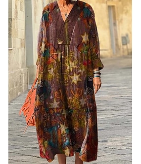 Vestido Midi Feminino V Neck Kaftan Leve Solto Ajuste A Linha Casual Saindo Solto Gráfico Floral Paisley Manga Longa V Neck Marinho Rosa Vermelho Azul Outono