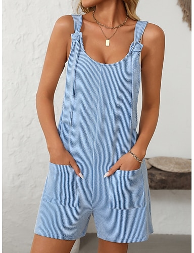 Mulheres Normal Macacão Ativo Listrado Sem Manga Decote V Botões Bolsos Férias Diário Ajuste Largo Cáqui Azul Claro Verão