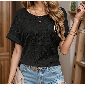 Mulheres Camiseta Blusas de malha com padrão de losango Bordado Côr Sólida Elegante à moda Casual Manga Curta Gola Redonda Decote Redondo Tops regulares Diário Para Noite Preto Verão Primavera