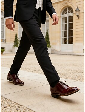 Sapatos sociais masculinos em couro vermelho e preto – design moderno para casamentos e eventos noturnos.