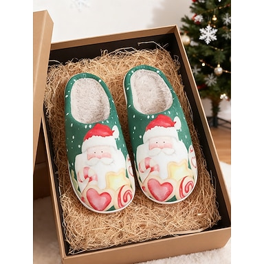 Pantufas masculinas vintage do Papai Noel - calçados de interior forrados com pelúcia macia e estampa natalina clássica, aconchegantes para usar em casa e presentes de Natal.