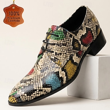 Sapatos Oxford masculinos com estampa multicolorida de pele de cobra, cadarço e estilo formal, ideais para casamentos, banquetes, festas, formaturas, desfiles de moda e eventos noturnos ousados.