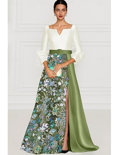 Tubinho Longo Vestidos de baile Vestidos de noite Vestido de Baile Elegante Split alta Manga 3/4 Gola Redonda Casamento Formal Cetim com Flor bordada Fru-Fru