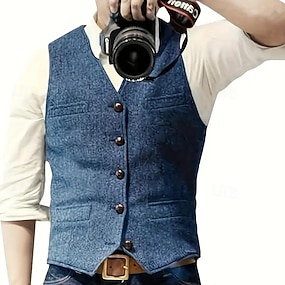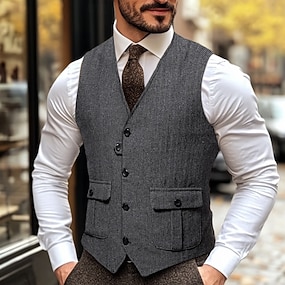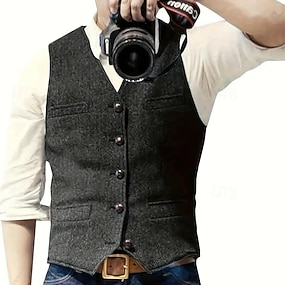 Colete masculino para férias, festas, moda outono/inverno, bolsos, botões, poliéster, confortável, xadrez, abotoamento simples com quatro botões, decote em V, modelagem regular, vermelho escuro.