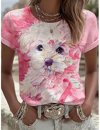 Mulheres Camiseta Imprimir Gráfico Animal Cachorro Vintage Casual Manga Curta Gola Redonda Tops regulares Diário Final de semana Azul Rosa Outono Inverno