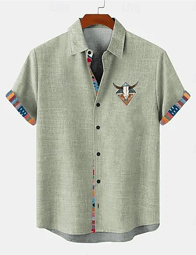 Homens Camisa Social Camisa de linho camisas retrô camisa vintage Camisa étnica Étnico Férias Diário Verde Caqui Bege Manga Curta Aberto para a Lateral Verão Primavera Roupa