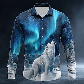 Homens Lobo Natureza e Paisagem Aurora Camisa Social camisa de botão Manga Longa Vintage retrô Ao ar livre Casual Caça Primavera Outono Aberto para a Lateral Impressão 3D camisas de colarinho Azul