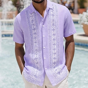 Homens Camisa Social Camisa casual camisa de botão Camisa Jacquard Branco Verde Claro Azul Marinha Verde Escuro Roxo Manga Curta Geométrica Tecido colar cubano Casual Diário Jacquard Roupa Elegante