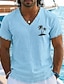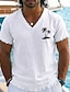 Camiseta masculina de linho e algodão com estampa de palmeiras, gola V, barra desfiada, ideal para férias de verão na praia, manga curta, tecido macio e estilo casual. Tamanhos P a 3XG.