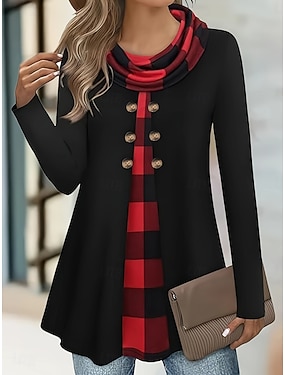 Mulheres Blusa Botões Imprimir Xadrez à moda Casual Manga Longa Gola Boba Tops regulares Diário Azul Branco Vermelho Verde Cáqui Primavera Outono Inverno