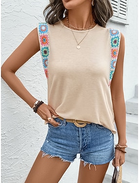 Mulheres Camiseta bordada Patchwork Bordado Floral Étnico Casual Sem Manga Gola Redonda Decote Redondo Tops regulares Diário Para Noite Preto Damasco Verão Primavera