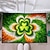 Tapete de porta para o Dia de São Patrício com estampa plana 2D de um trevo de quatro folhas radiante em tons de verde, laranja e branco, perfeito para decoração festiva.