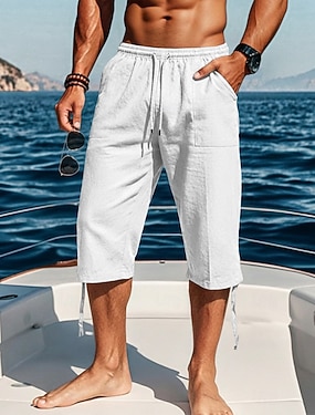Homens Calças de linho Calças Capri Calça verão Shorts de praia Com Cordão Cintura elástica Bolso frontal Côr Sólida Tecido Respirável Comprimento da panturrilha Diário Para Noite Férias à moda Azul