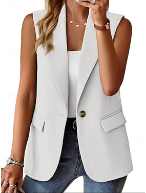 Mulheres Jaqueta casual Colete Confortável Respirável Bolsos Botões Casual Tecido Férias Rua Casual Roupa Diária Não Trespassado Padrão Lapela Normal Sem Manga agasalhos Preto Branco Vermelho Verão