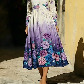 Mulheres Vestido midi Vestido casual Moda Diário Ao ar livre Férias Normal Floral Manga Longa Decote V Roxo Verão Primavera Outono