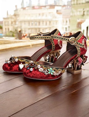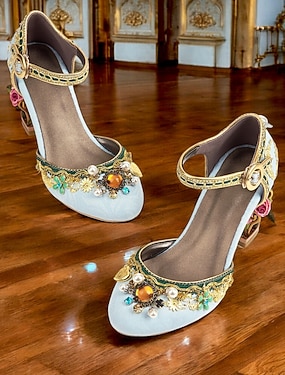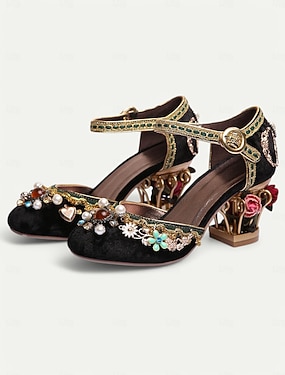Sapatos sociais femininos de salto grosso azul claro com enfeites florais de pedras preciosas - elegantes scarpins de tira no tornozelo com inspiração vintage para mulheres, ideais para casamentos,