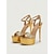 Sandálias femininas douradas de plataforma com salto alto e tira brilhante - sapatos elegantes para convidadas de casamento em cerimônias urbanas.