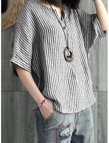 Blusa Feminina de Algodão e Linho Gráfica Elegante Vintage Estilosa Manga Curta V Neck Tops Regulares Diário Férias Botões Azul Cinza Verão Primavera