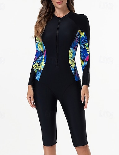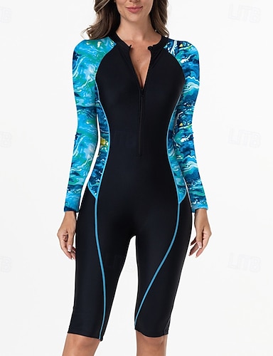 Mulheres Anti Atrito Roupa de banho One Pieces Gráfico Retalhos Zip Up Proteção UV Elasticidade Alta Manga Longa Roupa de Banho Surfe Mergulho Snorkeling Primavera