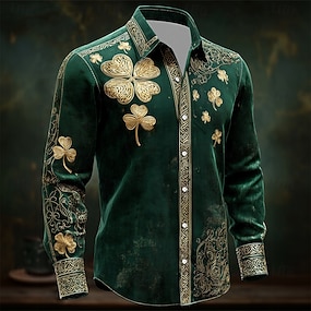 Camisa Masculina de Trevo de Quatro Folhas do Dia de São Patrício Camisa com Botão Manga Longa Vintage Retro Festa Feriado Primavera Outono Colarinho Turn Down Camisas com Impressão 3D Verde Escuro