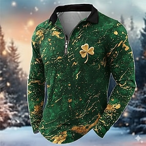 Camisas Polo Masculinas de Trevo com Zíper para o Dia de São Patrício Camisas Polo de Manga Longa Camisas com Lapela Casual ao Ar Livre Fantasia de Festival Impressão 3D Primavera Outono Verde