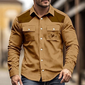 Homens Bloco de cor Com letras estampadas 1776 Camiseta de Veludo camisa ocidental Jaqueta Camisa Manga Longa Vintage retrô Ao ar livre Roupa de Trabalho Outono Inverno Aberto para a Lateral