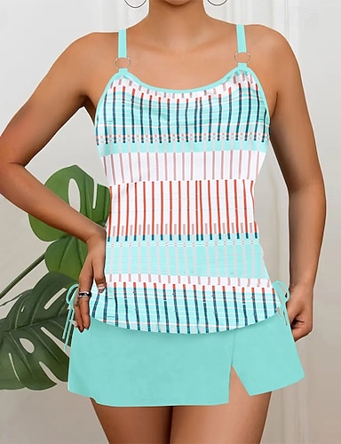 Mulheres Roupa de Banho 2 partes Saia roupa de banho Frente Única Férias Roupa de Praia Listrado Decote Redondo Sem Manga Fatos de banho