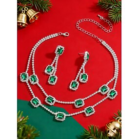 Conjunto de joias femininas com strass verde esmeralda para festa de Natal, elegante colar de cristal de camada dupla e brincos longos para celebrações de feriados &noites formais