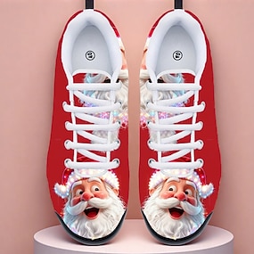 Tênis feminino de lona com estampa natalina do Papai Noel - um modelo casual e charmoso com cadarço e sola de borracha confortável, perfeito para passeios de inverno, festas de Natal, presentes e uso diário.