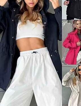 Mulheres Casaco com capuz Confortável Respirável Bolsos Botões Casual Bloco de cor Férias Rua Casual Roupa Diária Zíper Longo Com Capuz Normal Manga Longa agasalhos Branco Rosa Vermelho Primavera