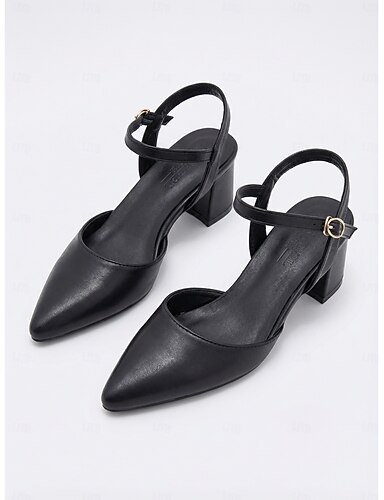 Sapato feminino profissional preto de bico fino com tira no calcanhar - elegante sapato de salto bloco com tira ajustável no tornozelo para reuniões de negócios e ocasiões formais de trabalho.