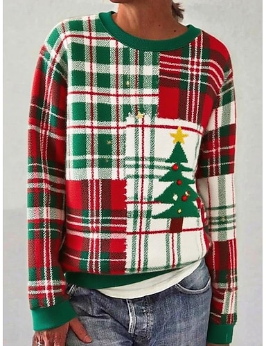 Mulheres Suéter Pulôver Férias Diário Casual Gráfico Animal Xadrez Estriado Gola Redonda Tricotado Imprimir Manga Longa Tops regulares Tricotar Natal Ao ar livre Final de semana Verde Outono Inverno