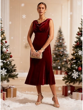 Mulheres Vestido midi Vestidos De Sereia Trompete Elegante Festa Convidado do casamento Coquetel Normal Côr Sólida Sem Manga Gola Boba Vinho