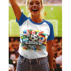 Camiseta Feminina World Soccer Match 2026 Impressão Gráfica Letra Estilosa Clássica Casual Manga Curta Gola Redonda Tops Regulares Diários Azul Amarelo Vermelho Verde Verão Primavera