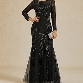 Mulheres Vestido Longo Vestidos De Sereia Trompete Elegante Festa Formal Coquetel Paetês Bordado Com Transparência Normal Côr Sólida Manga Longa Gola Redonda Vinho
