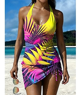 Maiô Feminino de Tankini 2 Peças com Saia Palma Vestido Costas Nuas Moda de Férias Praia Gráfico Tropical Decote em V Sem Mangas