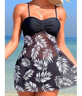 Tankini Feminino 2 Peças Maiô Sexy Com Recortes Com Arame Briefs de Palma Controle de Barriga Alto Slim Sem Costas Moda Praia para Férias Gráfico de Folhas V Neck Sem Mangas