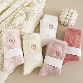 5 Pares de Meias Fuzzy de Fleece de Coral para Mulheres – Meias de Inverno Grossas e Quentes até a Batata da Perna com Bordado de Coração Meias Confortáveis para a Casa Escolha de Presente para o Frio