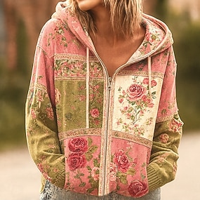 Moletom Hoodie Vintage Boho Estampado em 3D Feminino Moletom Patchwork Floral com Zíper Punk Ativo Vintage Manga Longa Com Capuz Tops Regulares Vestuário Diário Casual Patchwork Rosa Outono Inverno