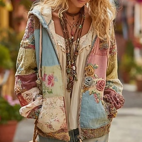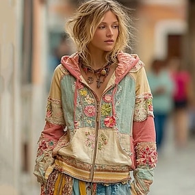 Womens Hoodie Vintage Boho Patchwork Sweatshirt Floral Zip Up Moda Casual Manga Longa Capuz Rua Casual Patchwork Zíper Bolso Vermelho Azul Roxo Fúcsia Verde Primavera Outono