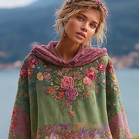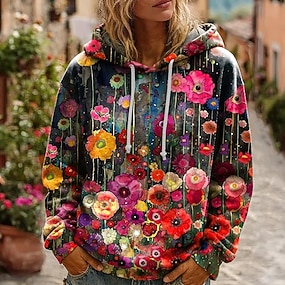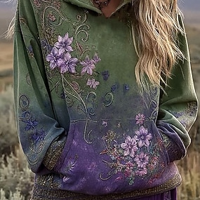 Moletom Hoodie Vintage Boho Estampado em 3D Feminino Moletom Patchwork Floral Pulôver Moletom Oversized Manga Longa Casual Quente Ativo Com Capuz Rua Vestuário Diário Azul Escuro Roxo Verde Primavera