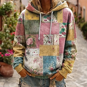 Moletom Capuz Vintage Boho 3D Impressão Mulheres Moletom Patchwork Floral Pullover Moletom Oversized Quente Ativo Com Capuz Roupas Diárias Street Patchwork Preto Branco Amarelo Rosa Escuro Primavera