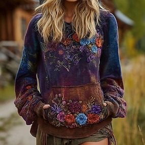 Moletom Hoodie Vintage Boho Estampado em 3D Feminino Moletom Patchwork Floral Pulôver Moletom Oversized Casual Quente Ativo Com Capuz Rua Vestuário Diário Patchwork Roxo Primavera Outono Inverno