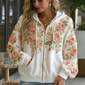 Mulheres Moletom Moletons com zíper Patchwork Zíper Imprimir Floral Gráfico Moda Casual Manga Longa Gola Redonda Tops regulares Rua Dia a Dia Prateado Rosa Roxo Primavera Outono Inverno