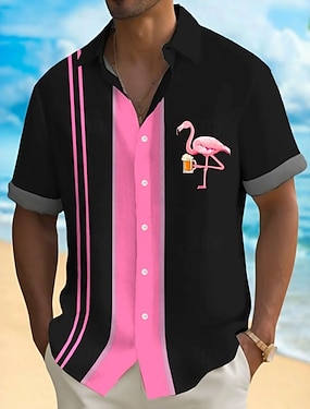 Homens Flamingo Camisa de boliche camisa de botão Camiseta Aloha Manga Curta Havaiana Recorrer Férias Casual Verão Primavera Aberto para a Lateral Abotoar Preto Branco