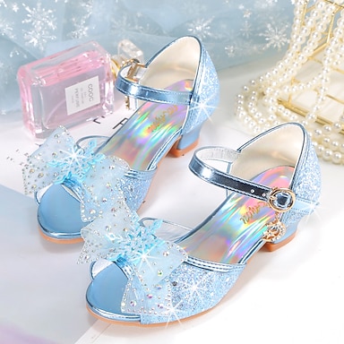 sapatos de princesa azuis brilhantes para meninas com laço e pingente de pérola – sandálias de salto baixo brilhantes para festas, casamentos e fantasias
