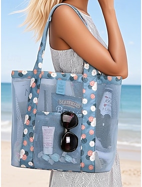 bolsa de praia feminina de malha floral – grande bolsa de ombro impermeável de verão com bolsos, leve e respirável para férias, piscina e viagens, vinho verde azul escuro